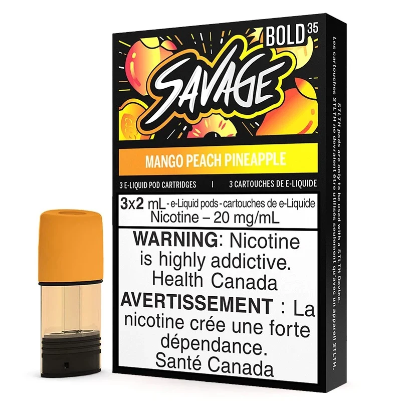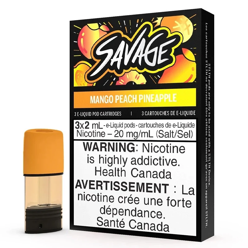 Savage: Mango Peach Pineapple pods by STLTH are loaded with ripe mangoes accented with notes of juicy peach and zesty pineapple. STLTH Savage: Mango Peach Pineapple pods are available in packs of 3, prefilled by the manufacturer, and are exclusively compatible with the STLTH Device and STLTH Starter Kit. Each pod has a ceramic atomizer that produces smooth and satisfying vapor, and holds 2mL of e-liquid, with your choice of nicotine salt strength.