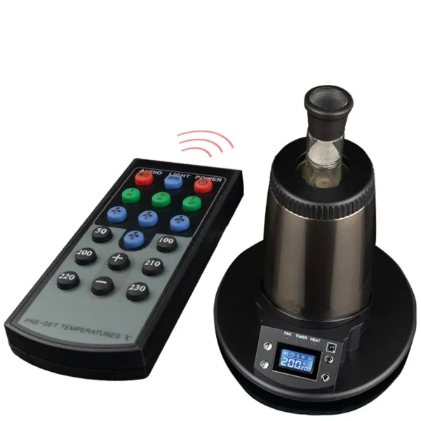 To control the Arizer Extreme Q, users can either interact with the four onboard buttons or with the included remote control. Either option will allow users to cycle through various heating temperatures, change the timer settings, or control the fan speed. All of these metrics are displayed on the device & rsquo; s LED screen, located on the central base of the Arizer Extreme Q.