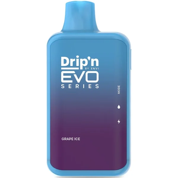 The Grape Ice flavour Drip’n EVO 28K Disposable Vape by Envi delivers up to 28000 puffs of vapor with 20mL of e-liquid and an 850mAh rechargeable battery, with an LED screenadjustable airflow, and multiple firing modes.