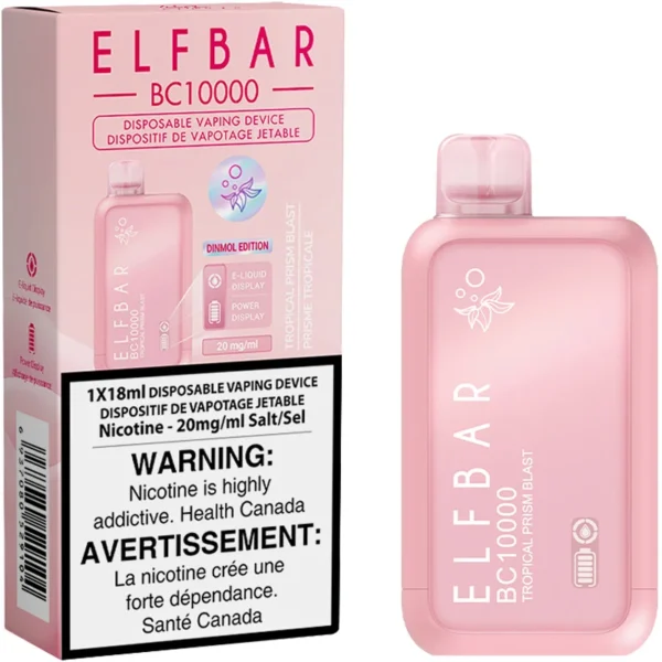 The Tropical Prism Blast flavour Elfbar BC10000 disposable vape delivers up to 10000 puffs of delicious vapor using 18mL of prefilled e-liquid and a 620mAh rechargeable battery, with an LED screen displaying the charge and e-liquid levels.
