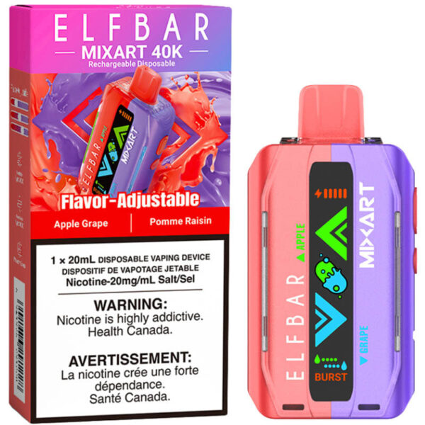 The Apple Grape Mixart 40K Disposable Vape by Elfbar delivers up to 40000 puffs of vapor with two 10mL e-liquid resevoirs and a dual flavour digital adjustment system, an 800mAh rechargeable battery, and multiple firing modes.
