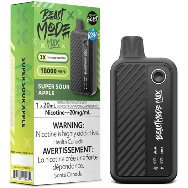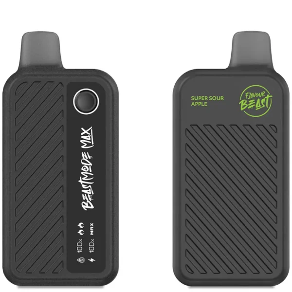 The Super Sour Apple flavour Beast Mode Max Disposable Vape by Flavour Beast has 20mL of e-liquid and a 850mAh rechargeable battery, an LED screen, and features 3 different power modes. Enjoy 18000 puffs of vapor with a single mesh coil at 11W with standard mode15000 puffs with dual coils at 17W with beast mode, or 12000 puffs with dual coils at 23W with max mode.
