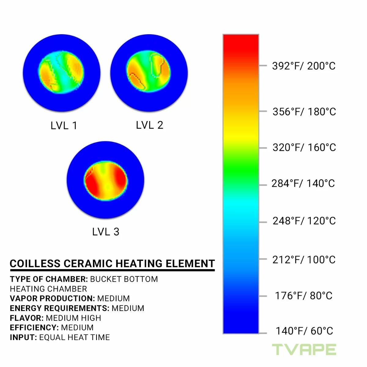 – Three Micro+ tank temperature settings (blue = low, green = medium, red = high)