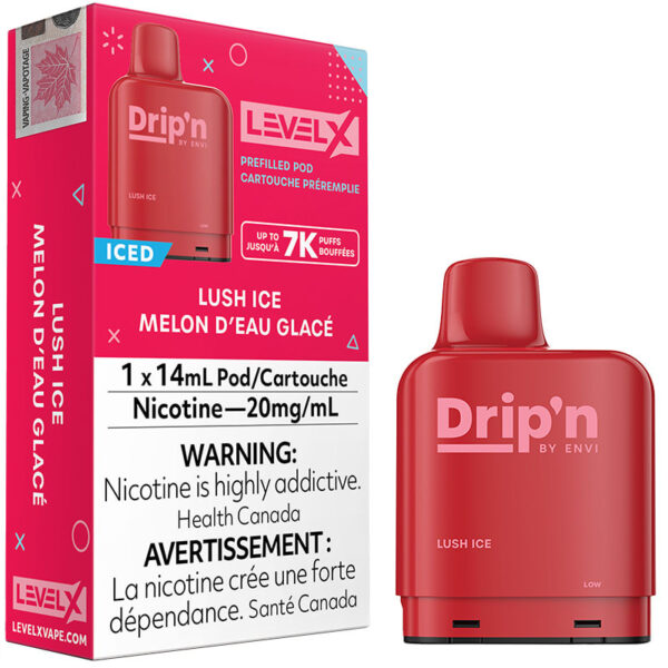 This Level X pod is prefilled with 14mL of Lush Ice flavour nic salt e-liquid from the Drip’n line by Envi, and pairs with a Level X Battery to deliver up to 7000 puffs of delicious vapor with a 1.0Ω mesh atomizer. Adjust the airflow by changing the pod direction, and customize the amount of vapor.