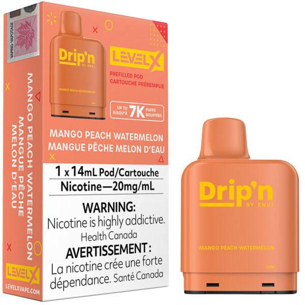 This Level X pod is prefilled with 14mL of Mango Peach Watermelon flavour nic salt e-liquid from the Drip’n line by Envi, and pairs with a Level X Battery to deliver up to 7000 puffs of delicious vapor with a 1.0Ω mesh atomizer. Adjust the airflow by changing the pod direction, and customize the amount of vapor.