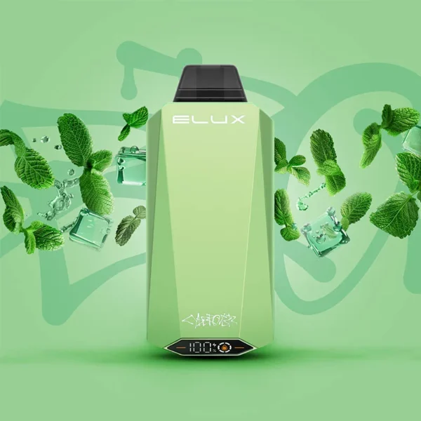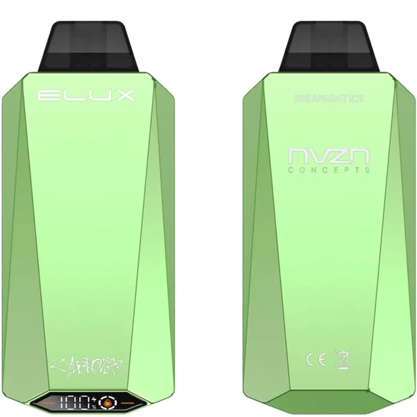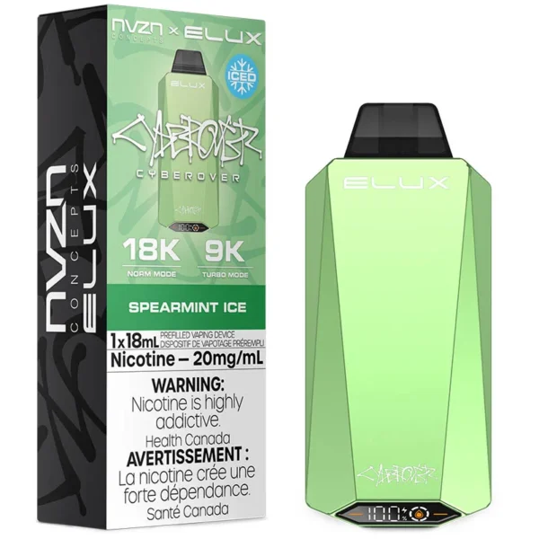 The Spearmint Ice flavour Elux Cyberover 18K disposable vape by NVZN Concepts delivers up to 18000 puffs of vapor with 18mL of e-liquid, a 600mAh recharegable batterymultiple firing modes, and a digital display.