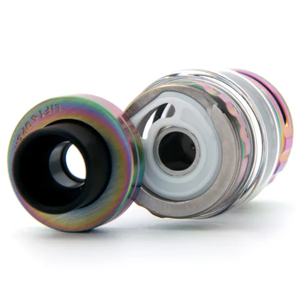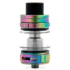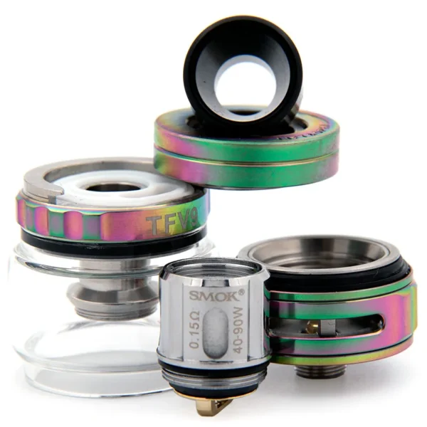 The SMOK TFV9 is a sub-ohm tank that features a Child Resistant Certified (CRC) spring loaded lift and twist open fill lid that provides enhanced safety and securely prevents leaks, and introduces a flavourful new coil series with backward compatibility. The TFV9 sports either a 28mm wide bubble tank with capacity for 6.5mL of e-liquid, or a 2mL slim tank where specifically labeled (limited to regions where required by legislation). The 810 drip tip has a wide bore, and the dual adjustable bottom airflow channels allow you to customize the direct to lung draw resistance. The new V9 coil series is cross compatible with the TFV8 Baby/Mini series of atomizers, and two V9 meshed 0.15Ω coils rated for 40 – 90W are included.