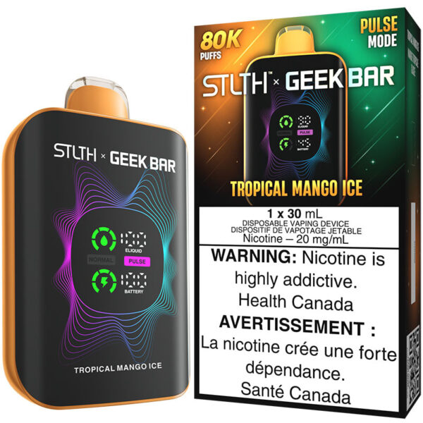 The Tropical Mango Ice flavour STLTH x Geek Bar 80K Disposable Vape is prefilled with 30mL of e-liquid and delivers up to 80000 puffs of vapor with multiple firing modesadjustable airflow, and a large screen with e-liquid and battery charge level indicators.