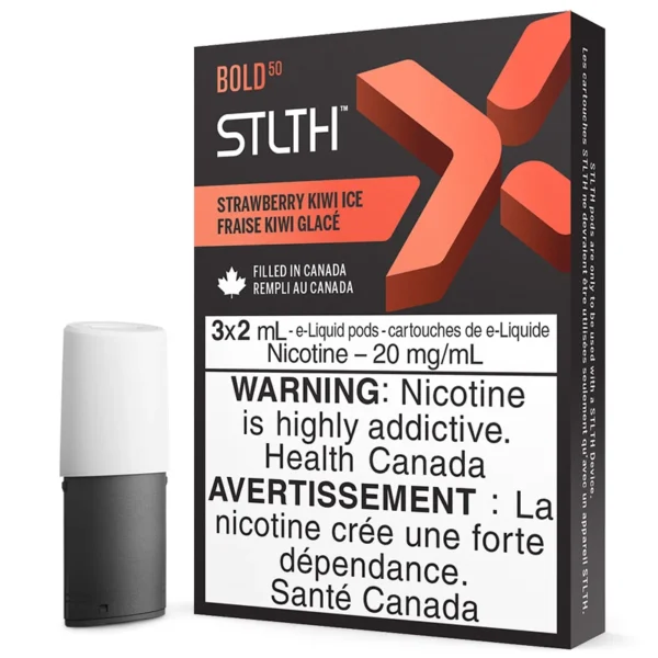 Crisp and juicy, Strawberry Kiwi Ice STLTH X Pods deliver a refreshing blend of fruit, berries, and menthol, with extra airflow and flavour. STLTH X Strawberry Kiwi Ice pods are available in packs of 3, prefilled by the manufacturer, and are exclusively compatible with the STLTH Device and STLTH Starter Kit. Each pod has a ceramic atomizer that produces smooth and satisfying vapor, and holds 2mL of e-liquid, with your choice of nicotine type and strength.