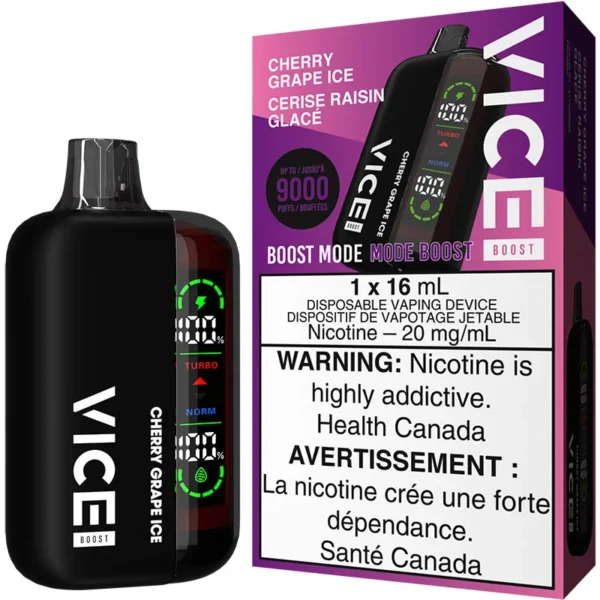 This Cherry Grape Ice flavour Vice Boost disposable vape delivers up to 9000 puffs of delicious vapor with 16mL of e-liquid, a 900mAh rechargeable battery, boost mode for enhanced airflow and flavour, and an LED screen to display the e-liquid and battery charge levels. A harmonious fusion of juicy cherries and succulent grapes, infused with a tantalizing icy touch.