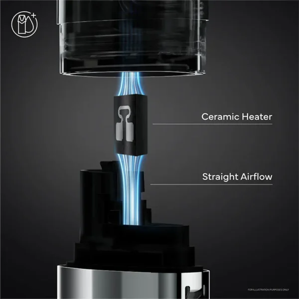 Close-up of a vaping device showcasing the FlavourMax™ technology, highlighting a ceramic heater and airflow design for enhanced flavor.